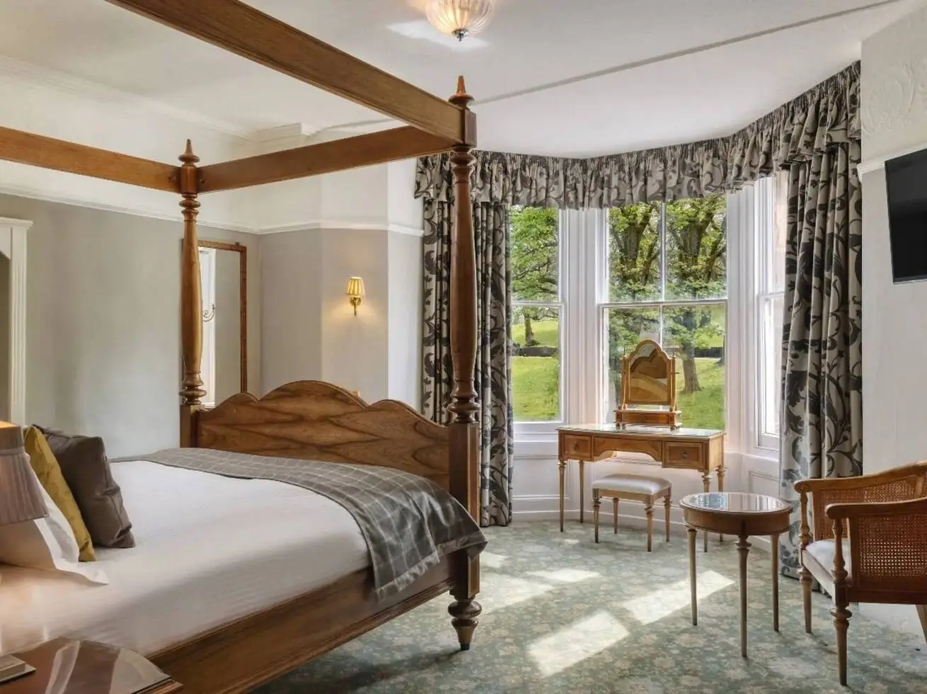 A Majestic room with a four poster bed, en suite bathroom, flat screen TV and tea and coffee making facilities.